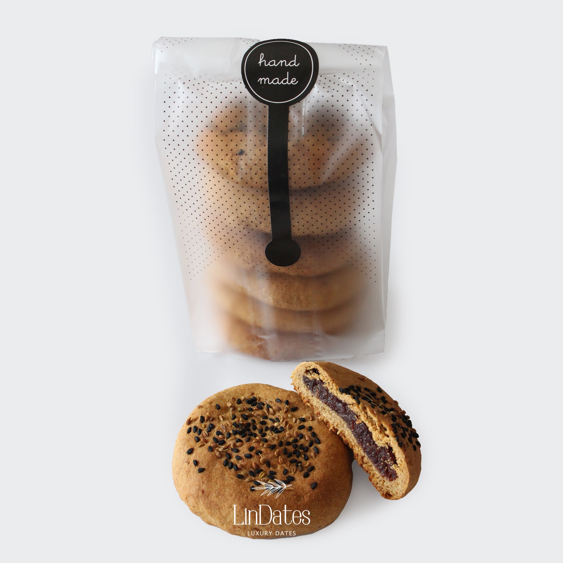 Delectable date cookies naturally sweetened with LinDates premium date syrup and filled with pure Medjool date paste. To add a delightful twist to our cookies, we flavored them with cardamom.
